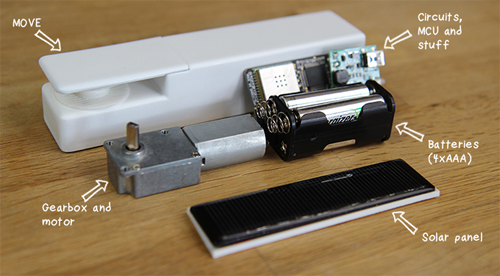 本身MOVE自带太阳能板,内部拥有可充电电池,这样就可以自循环电力。但是有许多地区日照不足,所以MOVE的设计也可以使用AC交流电和4节AA电池。从构造上看,MOVE内部非常简单,MCU和模块还有电机和电池占据整个身躯。提供的动力非常强劲,可以将几斤重的物体吊起来。