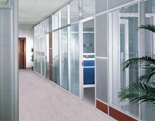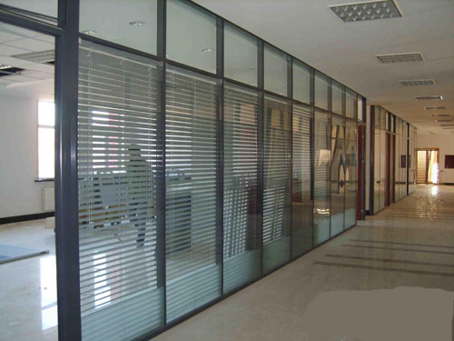 铝百叶窗帘,可以调整叶片的角度来调节光线,这样既保护了办公室的私密性又可以观察到外面的工作情况。这样的隔断既区分不同性质的工作空间,又能使办公室环境富于变化。它营造了一种似隔非隔,似断非断的宁静空间。